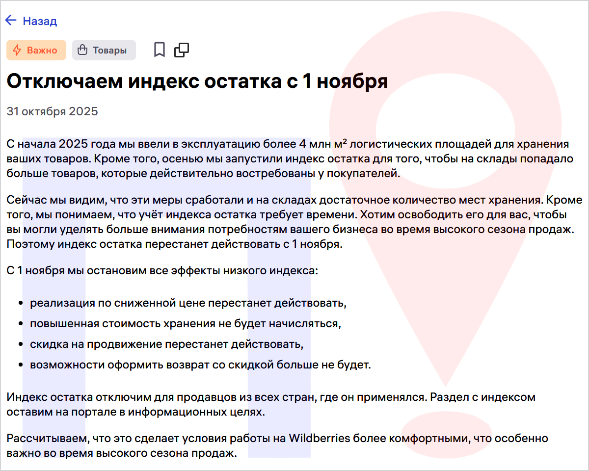 С 1 ноября 2025 года на Вайлдберриз перестанет действовать индекс остатков и все связанные с ним негативные эффекты. Это стало возможным благодаря позитивным изменениям на складах ВБ — сейчас на них достаточно места для хранения востребованных товаров. Поэтому ВБ принял решение отменить индекс остатков для продавцов на FBW (FBO) из всех стран, где он применялся. Однако раздел с индексом останется на сайте ВБ в информационных целях.