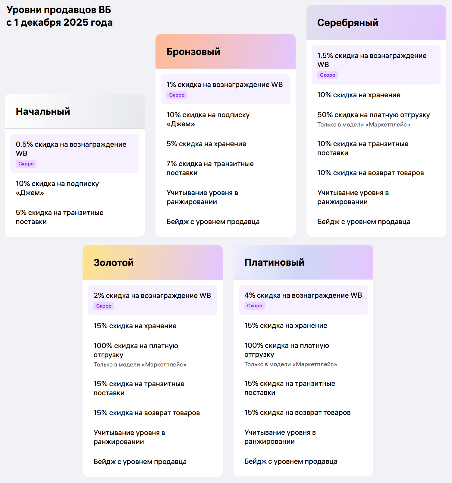 С 1 декабря 2025 года Wildberries обновляет условия программы лояльности для российских селлеров, которая теперь будет называться «Уровни продавцов». Пока она будет работать в тестовом режиме (о чем говорит пометка «Beta»). Главное нововведение новой программы — при выполнении ее условий продавцы получат скидку на комиссию с продаж (в размере от 0,5 до 4 п.п. в зависимости от своего уровня). Также теперь появляется новый «платиновый» уровень (наряду с существовавшими ранее «начальным», «бронзовым», «серебряным» и «золотым»). Чем выше уровень у селлера — тем больше поощрений от маркетплейса 👇