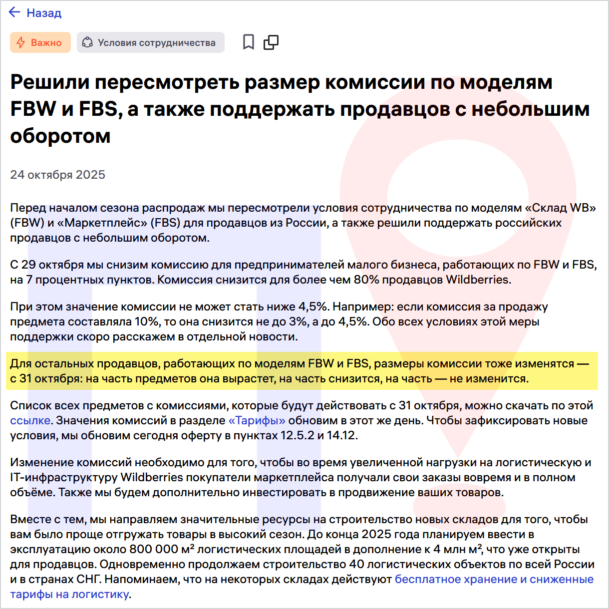 🔔 В связи с этим Вайлдберриз объявил о мерах поддержки продавцов с небольшим оборотом, чтобы поддержать их в высокий сезон. С 29 октября ВБ снизил комиссию на 7 п.п. (но не ниже 4,5%) для продавцов на FBW и FBS, оборот которых не превышают определенную сумму (по неофициальным данным — 1 млн рублей в месяц). Селлеры, подпадающие под условия поддержки, уже получили в своих личных кабинетах соответствующие уведомления (проверяйте сообщения в «колокольчике»). По оценкам самого ВБ, комиссия снизилась для более чем 80% продавцов на Wildberries. Однако под это определение также подпадают недействующие личные кабинеты селлеров, которые ничего не продают, тогда как для большинства реальных продавцов комиссия повысится.
