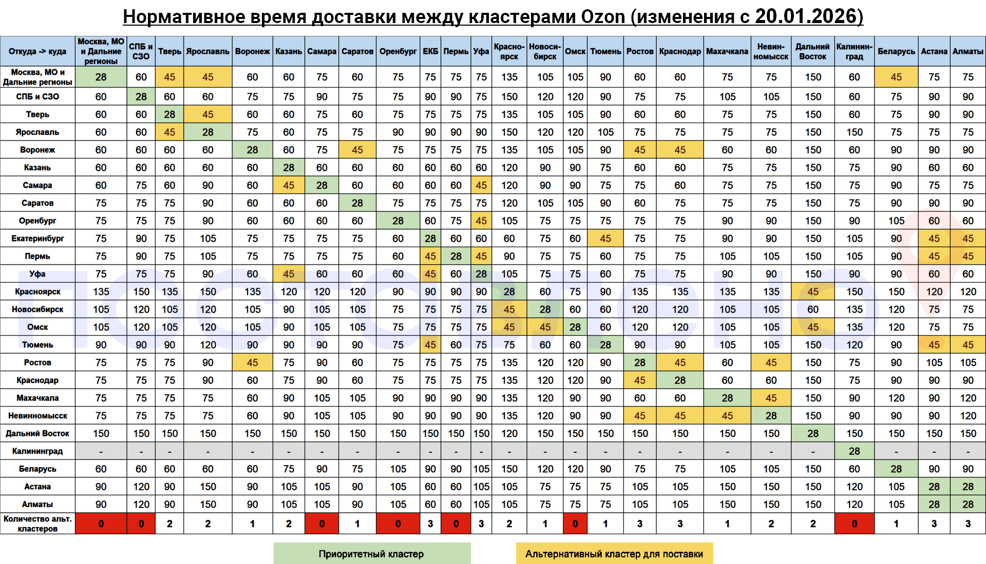 Соответствующие значения нормативного времени для каждого маршрута доставки Озон устанавливает в виде представленной ниже таблицы. Кластеры отгрузки приводятся слева (строчки), а кластеры назначения — сверху (столбцы). Приоритетные кластеры в таблице отмечены зеленым цветом (когда доставка происходит в пределах одного кластера), а альтернативные — желтым (обеспечивают наименьшее время после приоритетных). Склады, на которые можно отгрузить товары в соответствующих кластерах, приводятся в таблице выше.