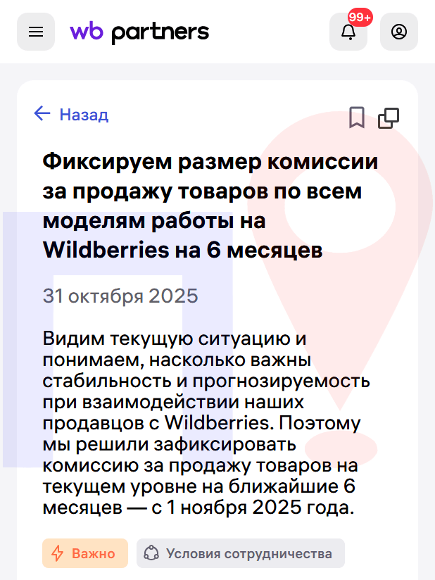 С 31 октября 2025 года Вайлдберриз пересмотрел размеры комиссии за продажу товаров по моделям FBO (FBW) и FBS. На большинство категорий товаров комиссия выросла на 5% (например, для одежды и обуви — с 29,5% до 34,5%). В некоторых категориях размер тарифа не изменился или даже снизился. Кроме того, с 29 октября ВБ снизил размер комиссии на 7% для продавцов с небольшим оборотом (уведомления об этом рассылались в личные кабинеты).
