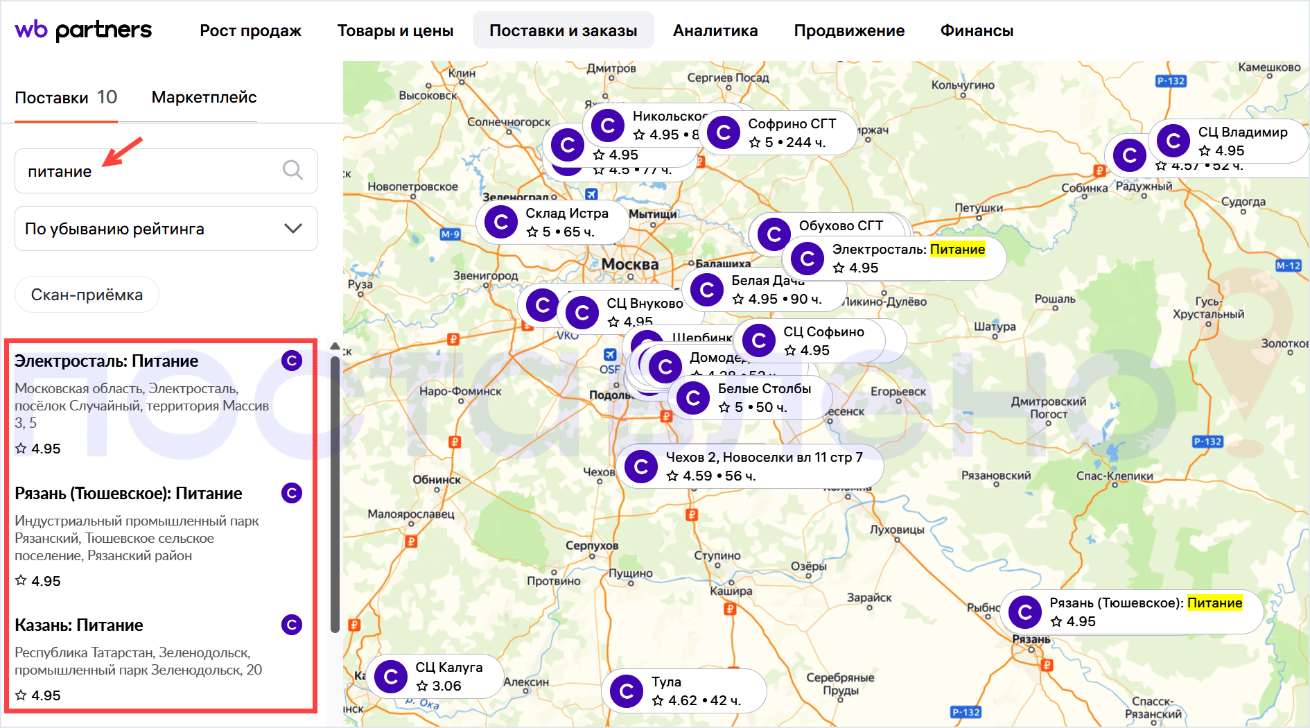 Теперь при создании поставок с продуктами питания и смежными товарами на Вайлдберриз продавцам нужно выбирать специальные виртуальные склады, в названии которых присутствует пометка «Питание». Всего их сейчас насчитывается 10 штук: