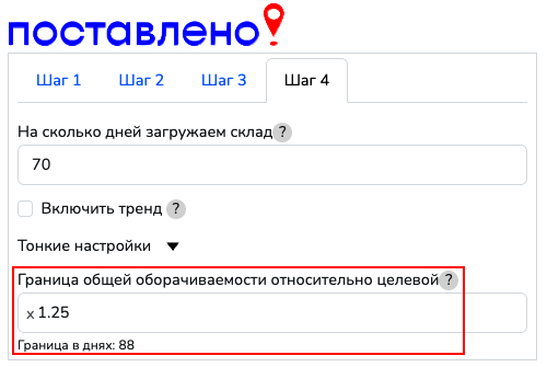 В сервисе «Поставлено!» эта настройка называется «Граница общей оборачиваемости относительно целевой». Чтобы её включить, нужно: