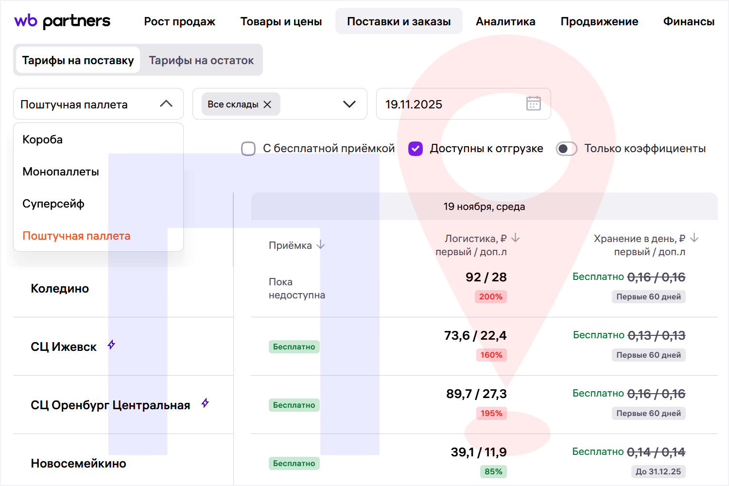 Тип поставки выбирается на этапе создания заявки на поставку и доступен на тех же складах Вайлдберриз, которые принимают поставки коробами. Если нужный вам склад принимает только монопаллеты и не работает с коробами, то поштучная паллета также будет недоступна.