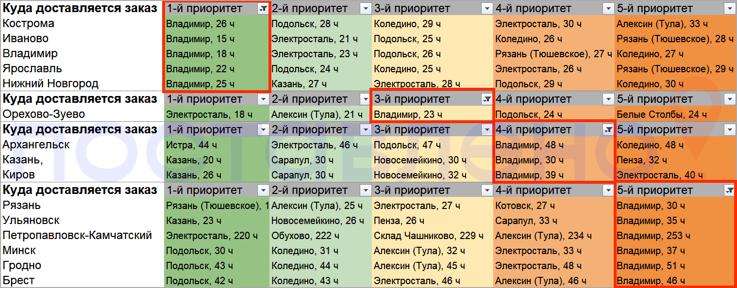 В противном случае товары со склада ВБ во Владимире будут продаваться очень медленно, удовлетворяя спрос в ближайших населенных пунктах, для которых этот склад является приоритетным по скорости доставки — это Владимир, Иваново, Кострома, Ярославль и др.