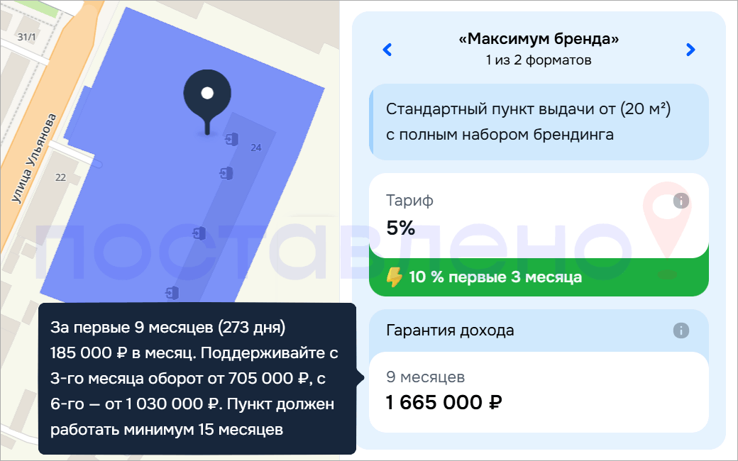 - Гарантия дохода — доплата разницы, если доход ПВЗ окажется меньше суммы, указанной на карте при выборе места расположения (действует первые 3 месяца после открытия).